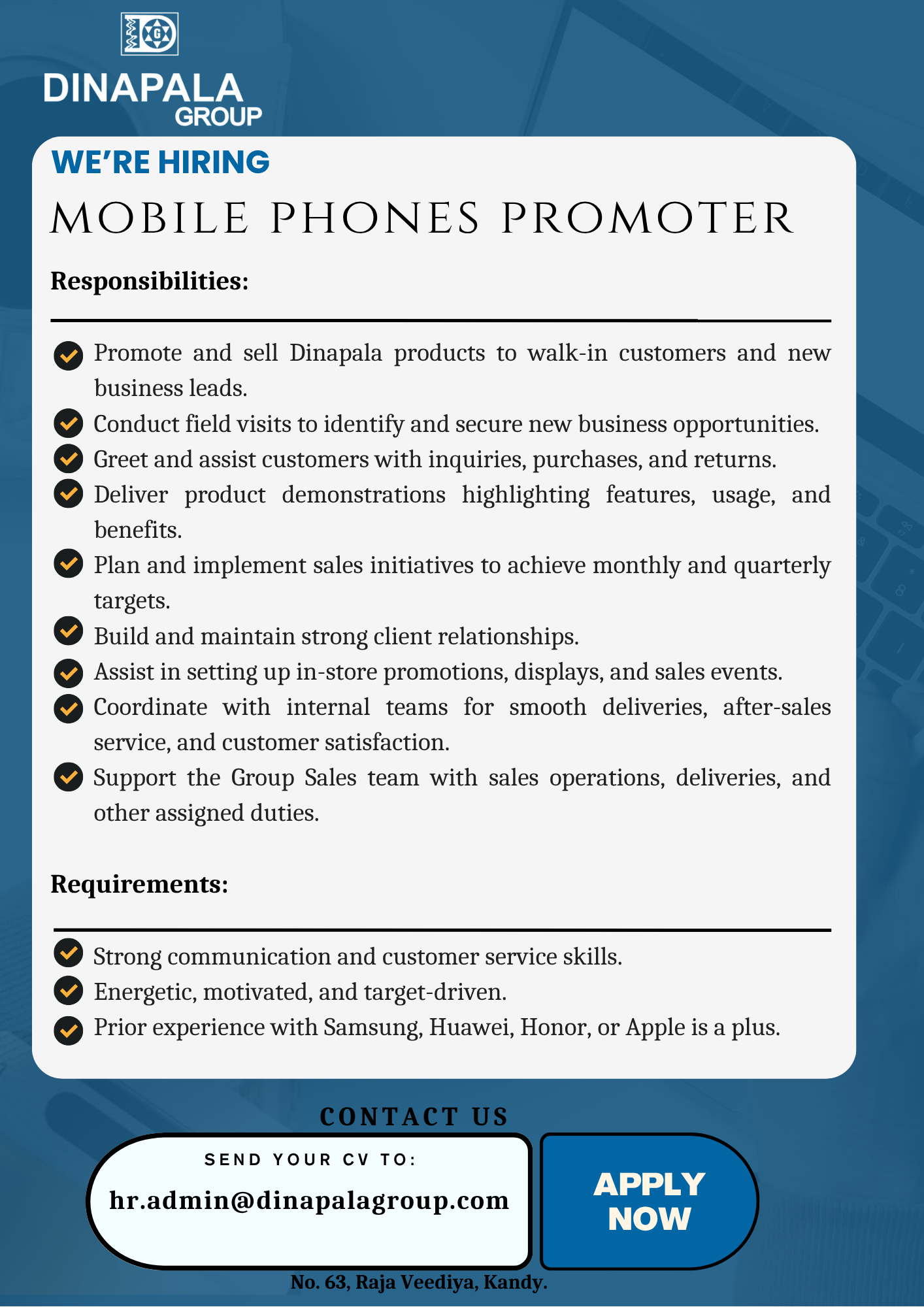 Please Select Correctly From the list below The Vacant Position That You Are Applying For Branch Managers - Western ProvinceMobile Phones Promoter - KandyStore Keeper / Sales Assistant - kurunegalaSales executive - Kurunegala
