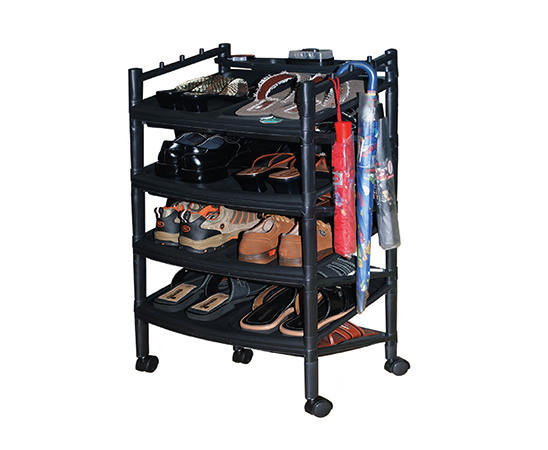 • Accommodate your entire shoe collection in a neat arrangement with a plastic shoe rack. Two stepped design will house sixteen pairs whereas the dedicated shelf will hold your polishing equipment. Comes with casters for easy movement and side rails will hold your umbrellas.