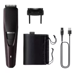 This beard trimmer comes with a USB cable for more flexible charging. The adaptor is not included (recommended adaptor Philips HQ87).
